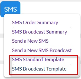 2.Go to ‘SMS’ in the top menu options and select ‘SMS Standard Template’ or 'SMS Broadcast Template' from the drop-down menu.