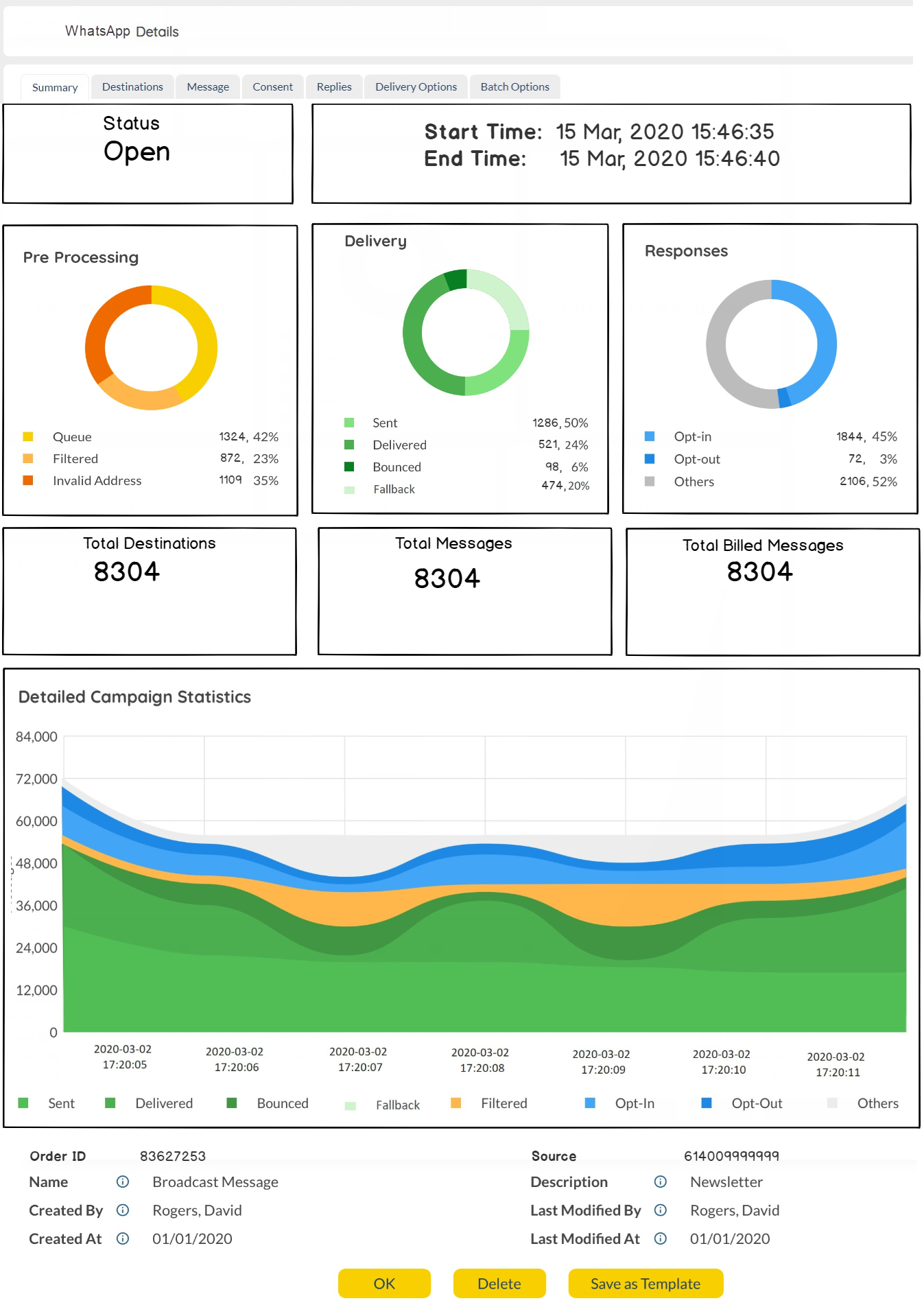 The chart presented with other statistics provides details like if the Order was Delivered, Bounced or Failed with precise time stamps.