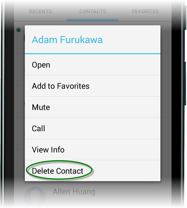 Once you've located the contact, tap and hold (long press) on the contact to bring up the menu, then select Delete. |