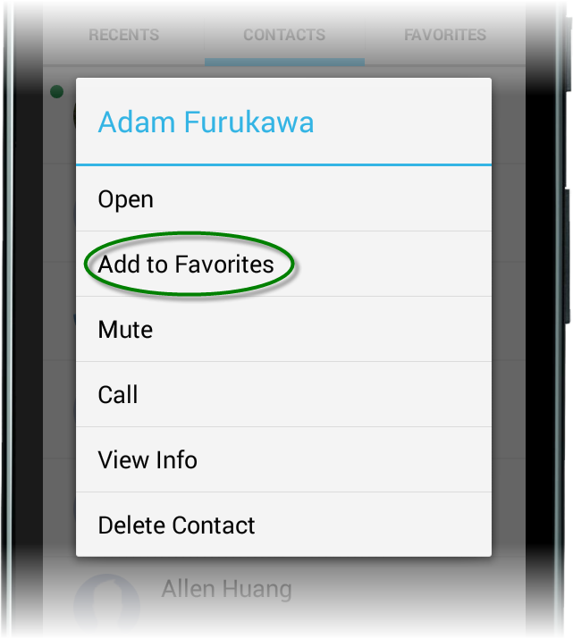 Add/Remove Contact from Favourites - Once you've located the contact, tap and hold (long press) on the contact to bring up the menu, then select Add to Favourites/Remove from Favourites.