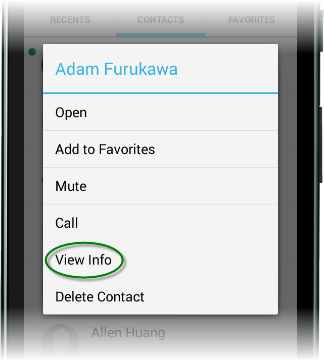 View Contact Details - Once you've located the contact, tap and hold (long press) on the contact to bring up the menu, then select View Info.