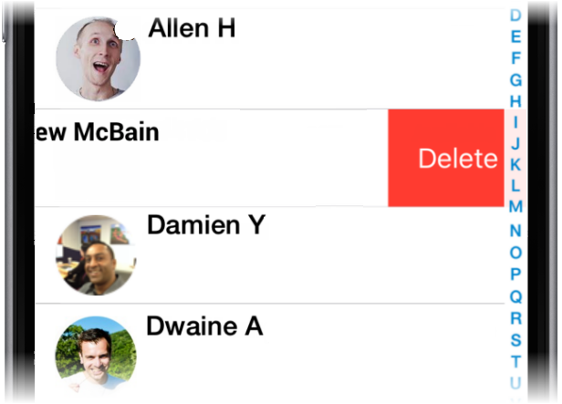 Delete Contacts - Once you've located the contact, swipe left to bring up the delete button. Tap the delete button. This stops a contact from displaying in your app, but they will still appear if you start entering their number when creating a new message using the New Message function.