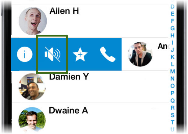 Once you've located the contact, swipe right to bring up the swipe controls and press the mute icon. The mute icon will appear to the right of the contact. To unmute, swipe right on the contact and press the mute icon again. |